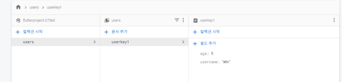 버튼을 눌러본 뒤 firebase에 가보면 다음과 같이 컬렉션이 추가되어있을 것이다. 그러면 당신은 성공한 것이다.