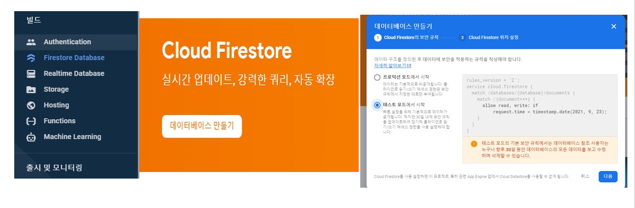 차례로 Firestore Database-데이타베이스 만들기- 테스트 모드에서 시작