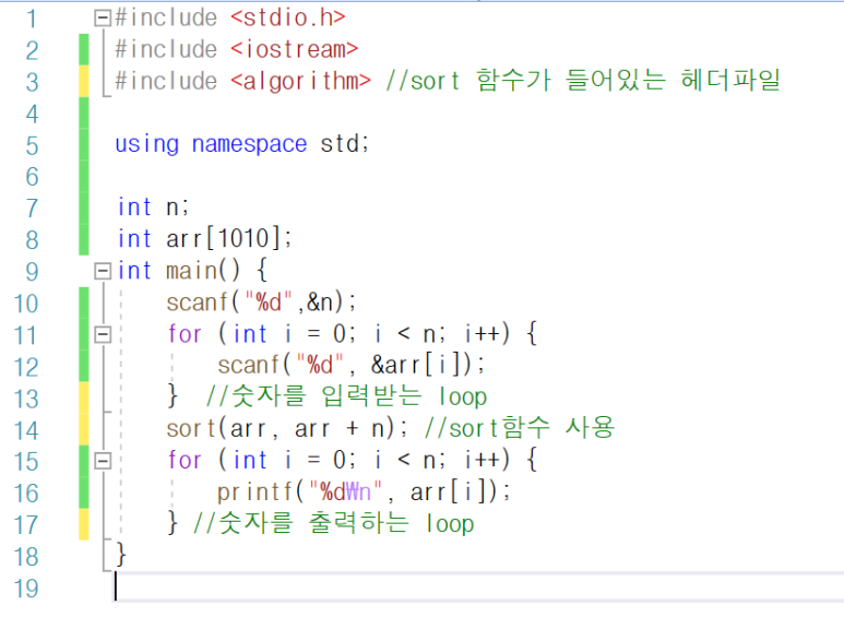 | sort(arr,arr+n); | 배열의 오름차순 정렬(n개의 칸을 가진) |