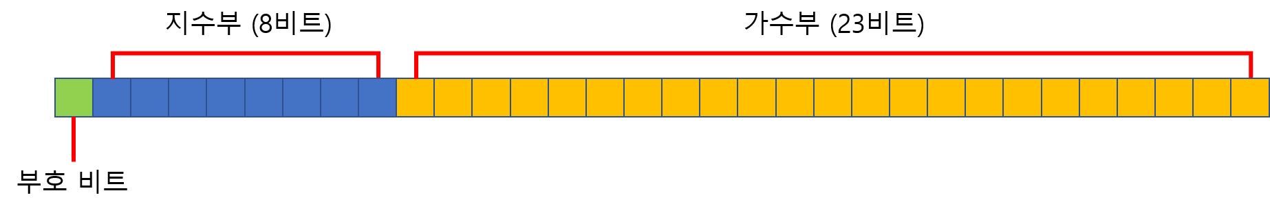 컴퓨터의 실수표현은 아래 이미지와 같이 지수부와 가수부, 부호비트로 나눈다.